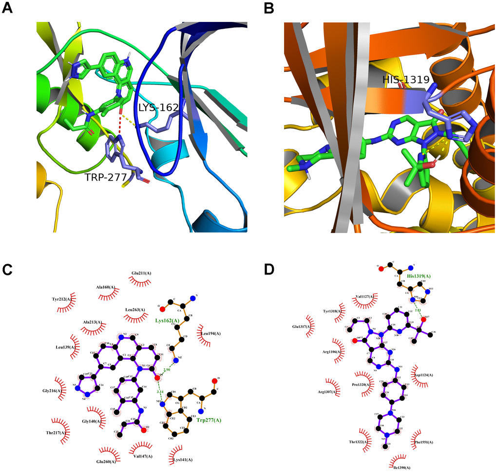 A preliminarily investigation was performed to verify whether there was direct targeting of the eight hub ferroptosis-related proteins of candidate drugs. The molecular docking results evaluated with binding energy have been presented in Table 2 (excluding the NOX4 and DUOX2 as unspecified protein structures). The small compound, QL-X-138, had the highest affinity but the lowest binding energy when targeted towards AURKA (-9.8 kcal/mol). Similarly, MK-1775 showed the highest affinity but the lowest binding energy when targeted towards DUOX1 (-9.3 kcal/mol). This analysis revealed the formation of two stable conformations with the lowest binding energies, among the 24 docking results. Next, the interactions between small compounds and amino acid residues were performed by Pymol and Ligplot. The ligand QL-X-138 formed a hydrogen bond with residue Lys162 and a pi-cation bond with Trp277 of protein AURKA (Figure 8A, 8C). While binding to DUOX1, MK-1775 formed a hydrogen bond with residue His1319 (Figure 8B, 8D). Two axes related to the two proteins in the ceRNA network were obtained (Figure 6D). The miRNAs and lncRNAs selected depend on the basis of their degree of connection might regulate AURKA and DUOX1 through ENSG00000248115-hsa-miR-335-AURKA and ENSG00000226828-hsa-miR-4265/hsa-miR-4296/hsa-miR-4322-DUOX1 axes at the transcriptome level, respectively.