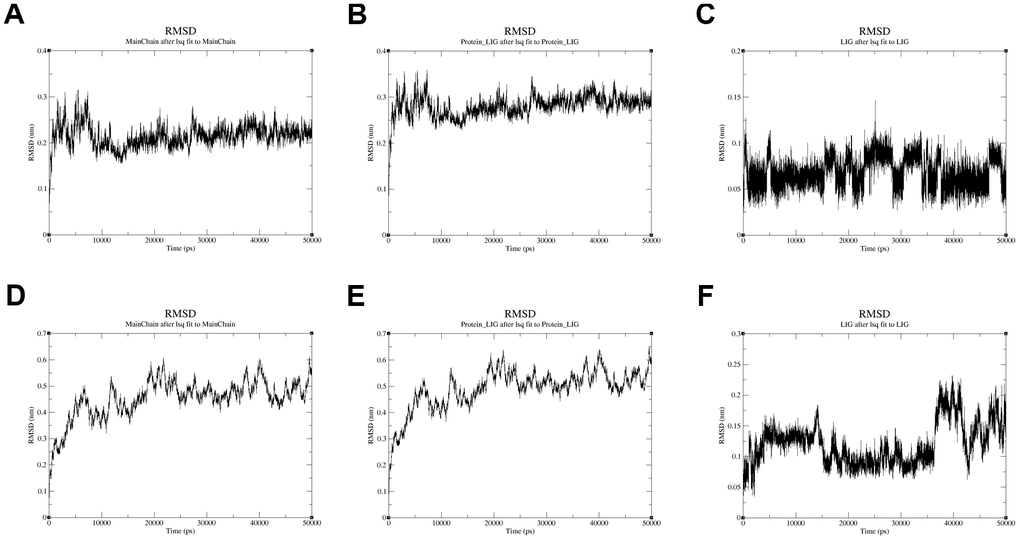 Moreover, the conformational stability of these two complexes was also verified by molecular dynamics simulation. The protein Calpha root-mean-square deviation (RMSD) data of QL-X-138 and AURKA, as well as MK-1775 and DUOX1, were obtained in terms of protein mainchains and protein-ligands. In comparison with the first frame in Figure 9A, 9D, the RMSD of the protein backbone of QL-X-138 and AURKA system became stable after 10 ns, with a deviation of 0.19. While the MK-1775 and DUOX1 system tended to become stable after 40 ns, with a deviation of 0.57. As for the protein-ligand RMSD, the system of QL-X-138 and AURKA, MK-1775 and DUOX1 both achieved equilibrium at 10 ns and 40 ns, with a deviation of 0.25 and 0.61, respectively (Figure 9B, 9E). Meanwhile, the RMSD of ligand QL-X-138 and MK-1775 was also stable at 5 ns and 36 ns as shown in Figure 9C, 9F, with a deviation of 0.09 and 0.14, respectively. Additionally, after reaching stability, the RMSD of the protein backbone, protein-ligand and ligand of the QL-X-138 and AURKA system maintained up to 45 ns. For all systems, the RMSD became stable after 40 ns. These data provided computational insight into the contribution of molecular dynamics simulation to the stable conformation of the systems of QL-X-138 and AURKA, MK-1775 and DUOX1.