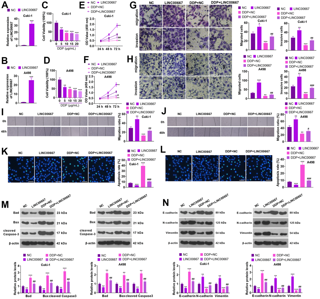 Caki and A498 cells were transfected with LINC00667 overexpression plasmids or negative control (NC), respectively. The transfection efficiency was confirmed by the qRT-PCR (Figure 2A, 2B, P<0.05). DDP (0, 5, 10, 15 and 20 μg/mL) treated Caki and A498 for 48 hours. MTT revealed that the viability of Caki and A498 cells decreased with increasing DDP concentration (Figure 2C, 2D, P<0.05). DDP (5 μg/mL) was used for treating Caki and A498 cells with LINC00667 overexpression. MTT and Transwell assays showed that overexpressing LINC00667 remarkably boosted the viability, migration, and invasion of Caki and A498 cells (versus the NC group). DDP resulted in the reverse consequences, while Caki and A498 cells’ viability, migration, and invasion were dramatically repressed by overexpression of LINC00667 (Figure 2E–2J, P<0.05 versus the DDP+NC group). TUNEL assay and western blot indicated that DDP resulted in elevated apoptosis in Caki and A498 (vis-à-vis the NC group). Overexpressing LINC00667 remarkably restrained apoptosis (against NC or DDP+NC) (Figure 2K–2M, P<0.05). Compared to the NC group, DDP distinctly facilitated the levels of E-cadherin but retarded N-cadherin and Vimentin levels. The profile of E-cadherin was markedly reduced, whereas N-cadherin and Vimentin profiles were elevated after overexpression of LINC00667 versus the NC or DDP+NC group (Figure 2N, P<0.05). Thus, overexpression of LINC00667 boosted ccRCC cells’ viability, migration, and invasion, suppressed apoptosis, and attenuated ccRCC cells’ sensitivity to DDP.