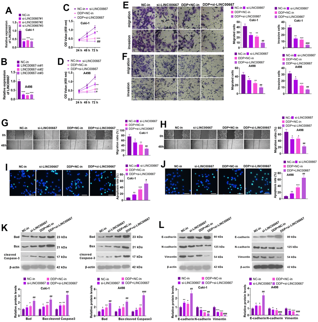 Caki and A498 cells were transfected with si-LINC00667 for knocking down LINC00667. The transfection efficiency was confirmed by the qRT-PCR (Figure 3A, 3B, P<0.05). Caki and A498 cells with LINC00667 knockdown or DDP treatment showed reduced cell viability, migration, and invasion. In addition, LINC00667 knockdown further increased the inhibitive effects of DDP on the two cells (Figure 3C–3H, P<0.05 versus the DDP+NC group). TUNEL assay and western blot indicated that LINC00667 knockdown and DDP administration both resulted in elevated apoptosis in Caki and A498 cells (vis-à-vis the NC-in group). si-LINC00667 remarkably accelerated the apoptotic level of Caki and A498 cells (against DDP+NC-in) (Figure 3I–3K, P<0.05). Moreover, the profile of E-cadherin was markedly enhanced, whereas N-cadherin and Vimentin profiles were reduced after the suppression of LINC00667 in DDP-treated cells (Figure 3L, P<0.05). Consequently, LINC00667 knockdown boosted ccRCC cells’ apoptosis and enhanced ccRCC cells’ sensitivity to DDP.