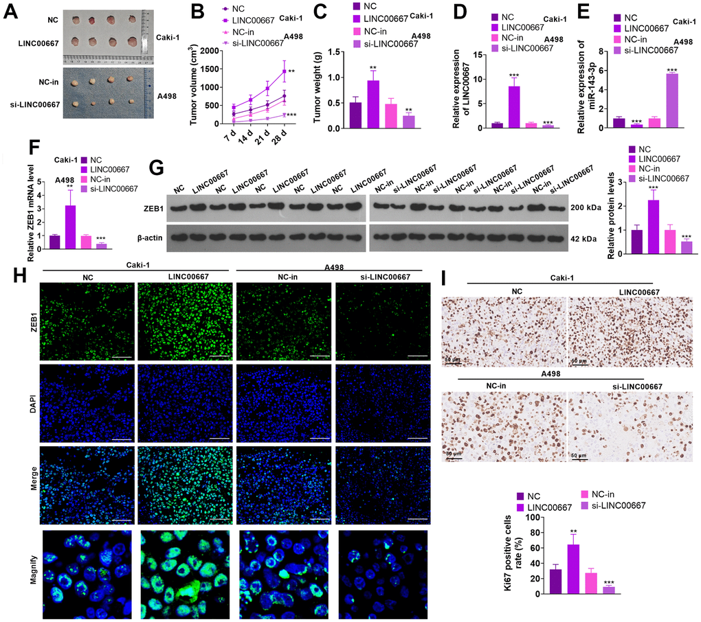 Caki cells (with LINC00667 overexpression) and A498 cells (with LINC00667 knockdown) were applied for constructing in-vivo tumor models. As a result, LINC00667 overexpression significantly advanced the growth of tumor volume and mass versus the NC group. In parallel, transfection of LINC00667-in suppressed the increase in the tumor volume and mass versus the NC-in group (Figure 4A–4C, P<0.05). qRT-PCR showed that LINC00667 overexpression notably facilitated LINC00667 expression and choked miR-143-3p profile in the tumor tissues (versus NC). By contrast, LINC00667-in significantly reduced LINC00667 expression and augmented miR-143-3p profile (against NC-in) (Figure 4D, 4E, P<0.05). qRT-PCR, WB and immunofluorescence results exhibited that overexpressing LINC00667 significantly facilitated ZEB1 expression (vis-à-vis NC). In contrast, LINC00667 knockdown vigorously abated ZEB1 expression versus the NC-in group (Figure 4F–4H, P<0.05). Overexpressing LINC00667 greatly enhanced Ki67-positive cell rate, and knocking down LINC00667 reduced Ki67-positive cell rate (Figure 4I, P<0.05). Thus, overexpressing LINC00667 accelerated ccRCC cell growth in an in-vivo xenograft tumor model.