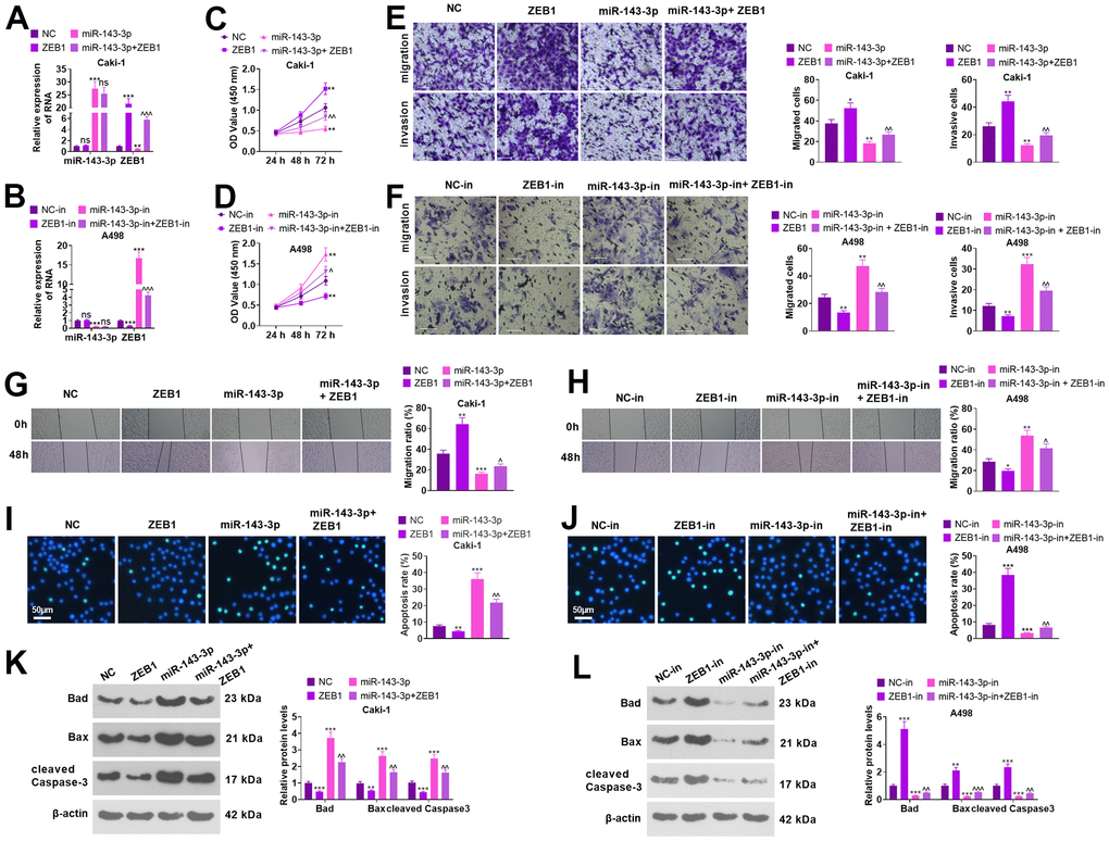 Caki cells were transfected together with ZEB1 overexpression plasmids and/or miR-143-3p mimics, and A498 cells were transfected with ZEB1-in and/or miR-143-3p-in (Figure 6A, 6B, P<0.05). Functional assays showed that overexpressing miR-143-3p choked the proliferation, migration, and invasion activities of Caki cells versus the NC group. In parallel, overexpression of ZEB1 significantly heightened proliferation, migration and invasion in Caki cells (in contrast with NC or miR-143-3p) (Figure 6C, 6E, 6G, P<0.05). miR-143-3p inhibition resulted in enhanced levels of migration, invasion, and proliferation in A498 cells versus the NC-in group. ZEB1-in notably curbed the activities of proliferation, migration and invasion in A498 cells versus the NC-in or miR-143-3p-in group (Figure 6D, 6F, 6H, P<0.05). As shown by the WB data, overexpressing ZEB1 or repressing miR-143-3p remarkably reduced cell apoptosis and enhanced EMT. Oppositely, ZEB1 knockdown or miR-143-3p upregulation promoted apoptosis and inhibited EMT (Figure 6I–6L, P<0.05). Thus, the miR-143-3p-ZEB1 axis greatly affected the apoptosis, migration, invasion, and proliferation of ccRCC cells.