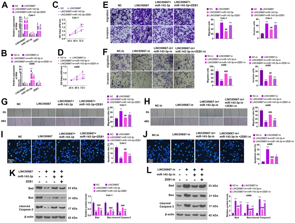 Rescue assays were conducted for to verify the functions of the LINC00667-miR-143-3p-ZEB1 axis in tumor cells (Figure 7A, 7B, P<0.05). As a result, miR- 143-3p repressed LINC00667 induced cell proliferation, migration, and invasion elevation, and enhanced cell apoptosis. Subsequent to ZEB1 overexpression, the migration, invasion, and proliferation levels of Caki went up, whereas apoptosis decreased (vis-à-vis LINC00667+miR-143-3p) (Figure 7C, 7E, 7G, 7I, 7KP<0.05). Knocking down miR-143-3p visibly reversed the LINC00667 knockdown-mediated tumor-suppressive effect versus the LINC00667-in group. Compared with LINC00667-in+miR-143-3p-in, knocking down ZEB1 culminated in significantly lessened proliferation, migration, and invasion and enhanced apoptosis in A498 (Figure 7D, 7F, 7H, 7J, 7L, P<0.05). Thus, overexpressing LINC00667 boosted ZEB1 by down-regulating miR-143-3p, which in turn fostered migration, invasion, and proliferation in ccRCC cells and restrained their apoptosis.