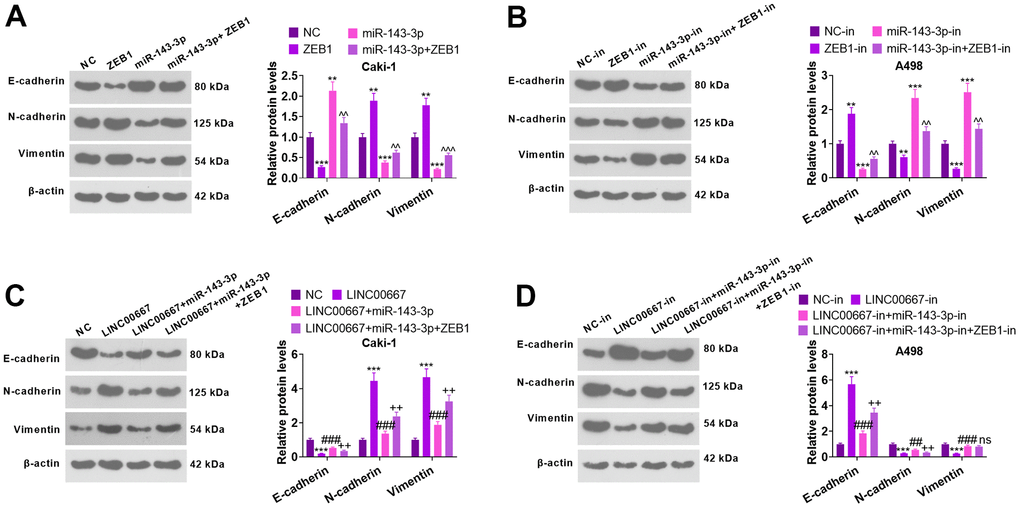 WB checked E-cadherin, N-cadherin, and Vimentin levels (Figure 8A–8D). As a result, overexpressing miR-143-3p elevated the E-cadherin level and repressed N-cadherin and Vimentin contents (versus NC). Vis-à-vis NC or miR-143-3p, overexpressing ZEB1 distinctly restricted E-cadherin’s level and stimulated N-cadherin and Vimentin levels (Figure 8A, P<0.05). miR-143-3p-in transfection brought about a distinct decrease in the level of E-cadherin and a marked increase in N-cadherin and Vimentin profiles (versus the NC-in group). In contrast, transfection with ZEB1-in remarkably facilitated the profile of E-cadherin and diminished N-cadherin and Vimentin levels (against NC-in or miR-143-3p-in) (Figure 8B, P< 0.05). As compared with NC, overexpressing LINC00667 choked the E-cadherin expression level and drove up N-cadherin and Vimentin profiles. On the contrary, overexpressing miR-143-3p heightened the level of E-cadherin and dampened N-cadherin and Vimentin expressions (versus LINC00667). Meanwhile, substantially impeded E-cadherin expression and bolstered N-cadherin and Vimentin levels were observed following ZEB1 overexpression (versus LINC00667+miR-143-3p) (Figure 8C, P<0.05). LINC00667-in greatly expanded E-cadherin expression and suppressed N-cadherin and Vimentin levels (vis-a- vis NC-in). Compared to the LINC00667-in group, transfection with miR-143-3p-in brought about a remarkable reduction in the profile of E-cadherin and a significant decrease in N-cadherin and Vimentin levels. Knockdown of ZEB1 dramatically facilitated E-cadherin’s expression and lessened the N-cadherin profile (against LINC00667-in+miR-143-3p-in) (Figure 8D, P<0.05). These results corroborated that overexpressing LINC00667 facilitated the EMT of ccRCC via the miR-143-3p- ZEB1 axis.