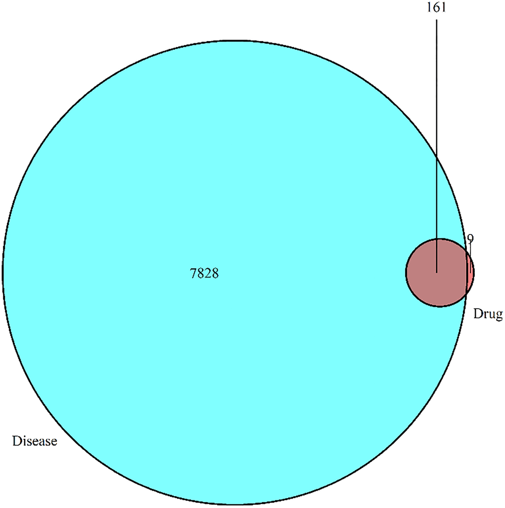 In the screening process, a total of 108 chemical components were identified in DHGC. The top 20 components are listed in Table 2. To identify protein targets associated with DHGC, we utilized the TCMSP database and subjected the resulting targets to normalization using the Uniprot database. This process yielded a total of 3,161 gene targets, from which 2,991 duplicate targets were eliminated, leaving a final count of 170 unique targets.
