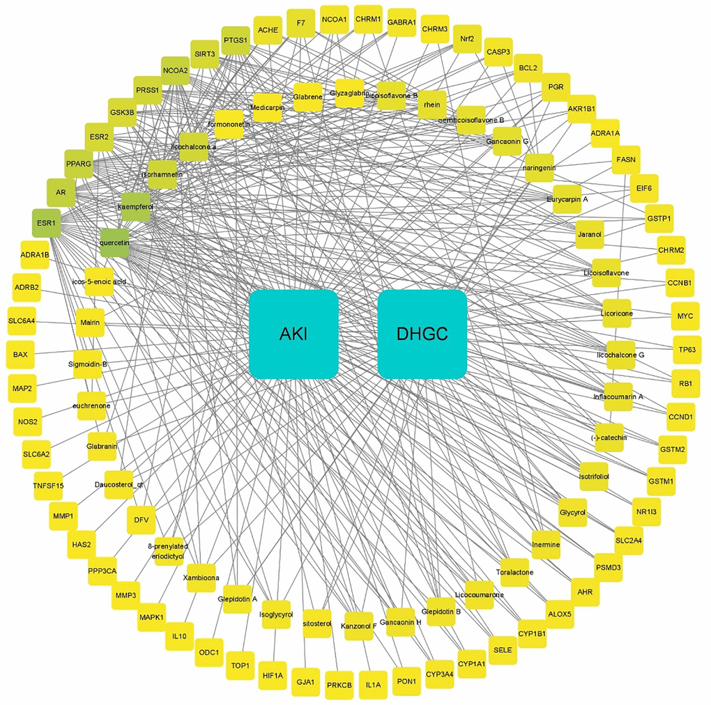 Acute kidney injury (AKI) is a critical clinical condition primarily managed through symptomatic therapy, as specific treatment strategies have yet to be identified. Nonetheless, herbal formulations have a long-standing history of aiding in the treatment of AKI [13]. In this study, we utilized network pharmacology to investigate the potential molecular mechanism underlying the anti-AKI effects of DHGC, a Chinese medicine formula. Our network pharmacological findings were further corroborated through animal experiments.