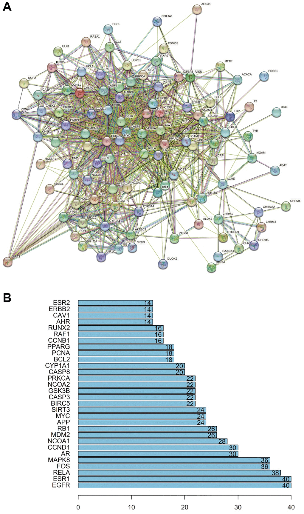The “DHGC-Active Ingredient-Target” network was constructed using Cytoscape 3.8.2 to elucidate the pharmacological mechanisms of action of DHGC. The intersected targets were imported into the STRING 11.0 database, and a PPI network model was constructed using “Homo sapiens” as the biological species set, with a confidence score >0.4 and unconnected nodes hidden. The resulting proteins were introduced into Cytoscape 3.8.2 software to construct the PPI networks, and node connectivity was analyzed to identify core targets.