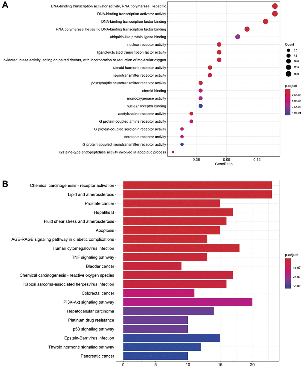 We also performed KEGG pathway analysis using the clusterProfiler package, with human as the selected species (organization = “has”) and P-value < 0.5 as the threshold. A total of 122 pathways were obtained, with the top 20 ranked based on the correlation and P-value. The pathways included chemical carcinogenesis-receptor activation, lipid and atherosclerosis, prostate cancer, hepatitis B, fluid shear stress and atherosclerosis, and apoptosis. Notably, the signaling pathways involving inflammation, oxidative stress, and apoptosis were highly correlated (Figure 4B).