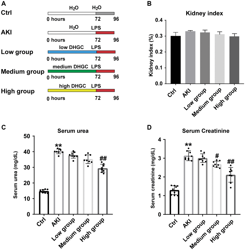 A schematic diagram of the animal experiment is depicted in Figure 5A. Briefly, mice were treated with DHGC for three days and then induced with AKI by intraperitoneal injection of LPS (10 mg/kg). There was no significant difference in kidney index among all groups (Figure 5B). Additionally, DHGC administration at a high dosage suppressed the elevation of urea and creatinine levels in AKI mice (P < 0.01, vs. AKI group) (Figure 5C, 5D).
