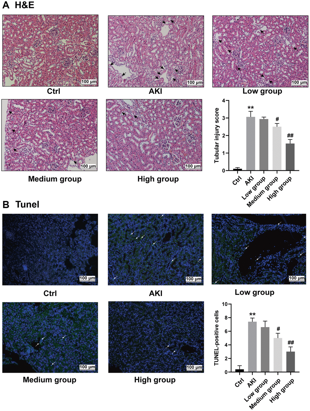 The renoprotective effect of DHGC against renal injury was demonstrated through H&E staining of the kidneys. Mice subjected to LPS injection exhibited noticeable edema in the renal tubular epithelial cells, which was prevented in all DHGC-treated groups. The renal tubule injury score was gradually reduced after DHGC gradient intervention (P < 0.01, vs. AKI group) (Figure 6A). Additionally, LPS-induced injury resulted in a significant increase in the number of TUNEL-positive cells in kidney tissue, while DHGC treatment led to a significant reduction in apoptotic cells in kidney tissue samples. TUNEL-positive cells were significantly reduced after DHGC intervention (P < 0.01, vs. AKI group) (Figure 6B).