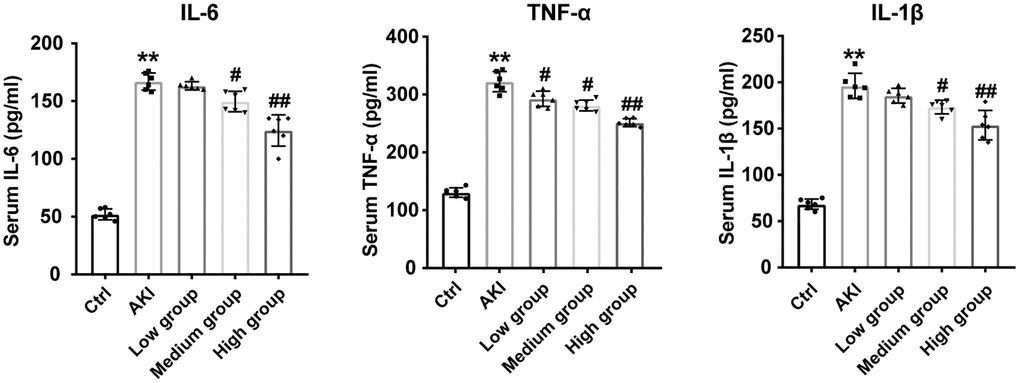Elevated levels of proinflammatory cytokines are a hallmark of acute kidney injury [12]. To investigate whether DHGC affects the inflammatory response, we measured the levels of these cytokines in serum. As shown in Figure 7, IL-6, TNF-α, and IL-1β levels were significantly increased in the AKI group, whereas DHGC intervention significantly reduced these cytokine levels. These findings suggest that DHGC effectively attenuated the LPS-induced inflammatory response.