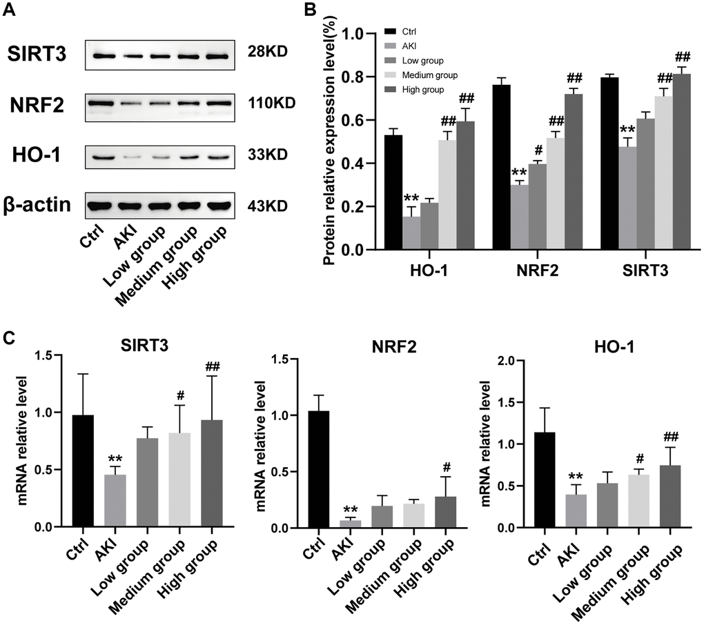 Total protein was extracted from kidney tissues using RIPA buffer (G2033, Servicebio, Wuhan, China), along with a protease inhibitor cocktail (G2006, Servicebio, Wuhan, China). The protein concentration was determined using a bicinchoninic acid (BCA) protein assay kit (G2026, Servicebio, Wuhan, China). The protein samples were separated on sodium dodecyl sulfate-polyacrylamide gel electrophoresis (SDS-PAGE) gels and transferred onto polyvinylidene difluoride (PVDF) membranes. After blocking with 5% skim milk in Tris-buffered saline tween-20 (TBST) for 1 hour, the membranes were incubated separately with primary antibodies at 4°C overnight, including SIRT3, NRF2, HO-1, and β-actin. After washing with TBST, the membranes were incubated with a secondary antibody conjugated with horseradish peroxidase (HRP) for 1.5 hours. The protein signals were finally visualized using an ECL Protein Detection kit.