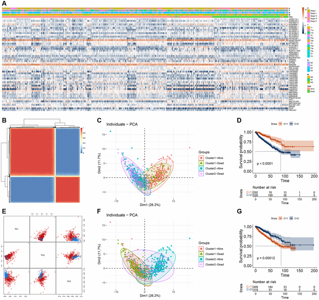 Cuproptosis was closely related to the cancer progression and may be a new therapeutic target for several cancers. To obtain suitable cuproptosis signatures as RCC biomarkers, we firstly performed the correlation analysis for those 19 CRGs and lncRNAs, and obtained 2872 cuproptosis-related lncRNAs (CRLs). Of those 2872 CRLs, a total of 53 CRLs were significantly different in expression between alive and dead RCC patients (28 CRLs were significantly increased and 25 CRLs were significantly decreased) (Figure 2A). RCC patients could be well divided into two clusters by using those 53 differentially expressed CRLs (DECRLs) as measured by consensusclust and MClust analysis (Figure 2B–2G). The survival curves of RCC patients in different cluster classified by these two methods were significantly different (Figure 2D, 2G).