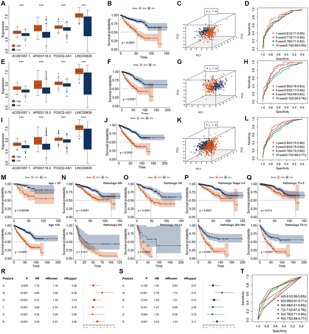 In the validation and entire group, we observed very similar results (Figure 4E–4L). In particular, we found that the AUC values of the 1-year and 3-year ROC curves in the validation group were as high as 0.85 and 0.83, respectively (Figure 4H). The AUC values of 1-year and 3-year ROC curves in the entire group were as high as 0.82 and 0.80, respectively (Figure 4L). Moreover, we found that the relationship between this risk model and survival was regardless of age, pathologic TNM, and Stage (Figure 4M–4Q).