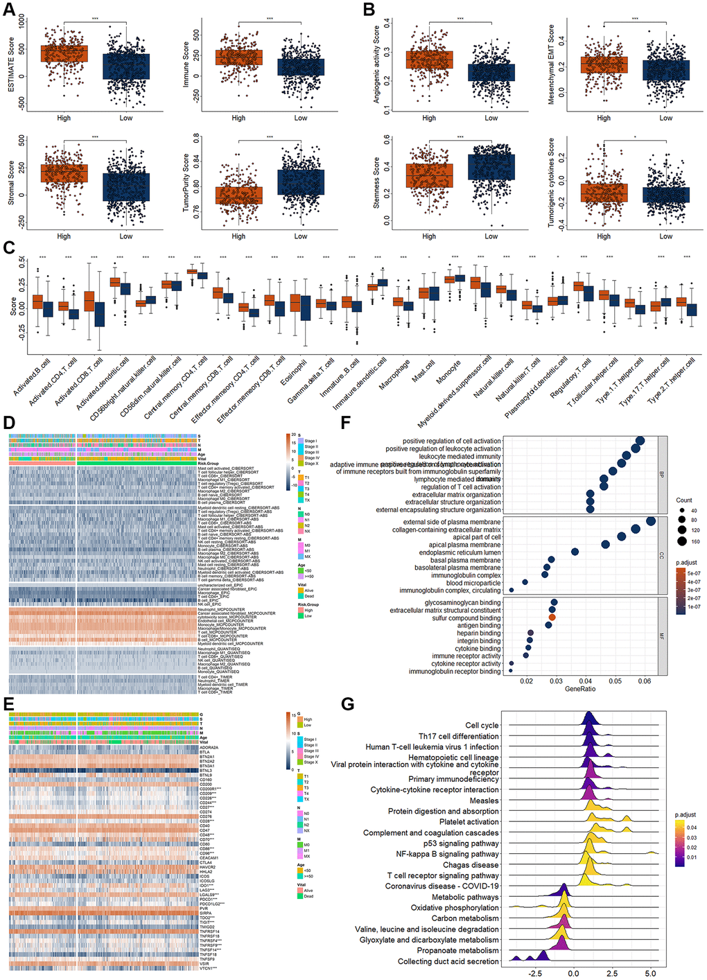 Understanding the immune status and tumor microenvironment of tumor patients is of great significance for the treatment of tumor patients. In this study, we found that stomal score, immune score, and ESTIMATE score were significantly higher in high-risk RCC patients, and tumor purity were significantly lower in high-risk RCC patients. Tumor purity refers to the proportion of tumor cells in the tumor tissue. Tumor tissue includes not only tumor cells, but also many other cells associated with the tumor microenvironment, such as immune cells. ESTIMATE is a tool that uses genes expression data to predict tumor purity and the presence of stromal and immune status in tumor tissue [47, 48]. Tumor samples with lower tumor purity have more immune cells, and the mutation load is often higher, because the inflammatory response caused by immune cells can increase the mutation rate of tumor cells, and the immunotherapy effect may be better [48]. In the evaluation studies of tumor microenvironment, we found that the scores of angiogenic activity, mesenchymal EMT, and tumorigenic cytokines were significantly increased in high-risk RCC patients, and stemness score was significantly decreased in high-risk patients. Tumor stem cells are cancer cells that have characteristics associated with normal stem cells and can produce all cell types in a specific cancer sample [49]. Such cells are generally thought to have the potential to form tumors and develop into cancer, especially as the cancer metastasizes, giving rise to new types of cancer [49]. In this study, we found that increased dry index scores in low-risk RCC patients suggest that low-risk RCC patients are at risk for further deterioration.