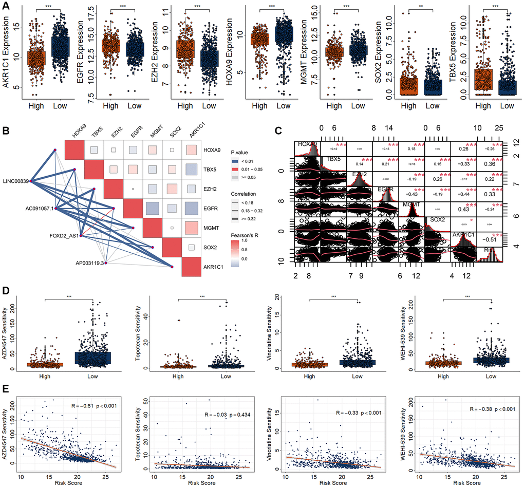 To determine chemotherapy drug sensitivity among high- and low-risk group, we firstly observed the expression of several chemoradiotherapy sensitivity–related genes (CRSGs), including AKR1C1, EGFR, EZH2, HOXA9, MGMT, SOX2, and TBX5 [24]. The expression of AKR1C1, HOXA9, and MGMT were significantly increased in low-risk group, while the expression of EGFR, EZH2, SOX2, and TBX5 were significantly decreased in high-risk group (Figure 7A). These CRSGs were correlated with candidate biomarkers and risk models (Figure 7B, 7C).