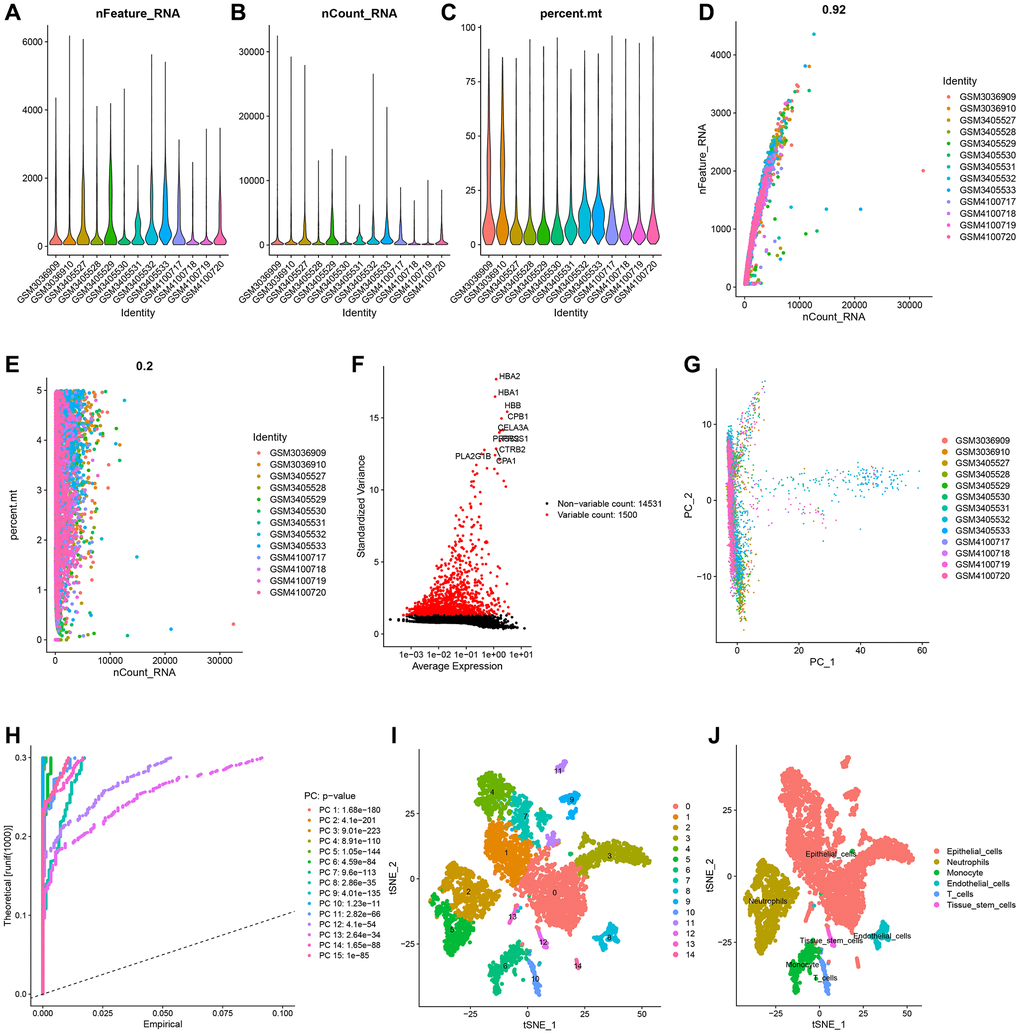 For quality control, analysis, and exploration of single-cell RNA expression data, the R software packages “Seurat” and “SingleR” were employed [40, 41]. To obtain high-quality data on single-cell RNA expression, the following filtering criteria were established: (1) exclusion of genes smaller than those detected in 3 cells, (2) exclusion of cells with fewer than 50 detected genes, and (3) exclusion of cells in which mitochondrial gene expression accounts for more than 5% of total gene expression. Single-cell RNA expression data were normalized using the “Normalize Data” program. The “Find Variable Feature” tool was used to determine the top 1500 genes whose expression changed significantly. The “Run PCA” tool was used to conduct principal component analysis (PCA) on the top 1500 genes, and the P-value of each principal component was obtained. The top 15 main components were chosen and subjected to t-distributed stochastic neighbor embedding (t-SNE) cell clustering analysis. To identify marker genes, differentially expressed genes across distinct cell clusters were examined using the following criteria: adjusted P-value < 0.05 and |log2 (fold-change)| > 1. Annotation of cell clusters was conducted using reference data from Human Primary Cell Atlas for reference-based annotation [42].
