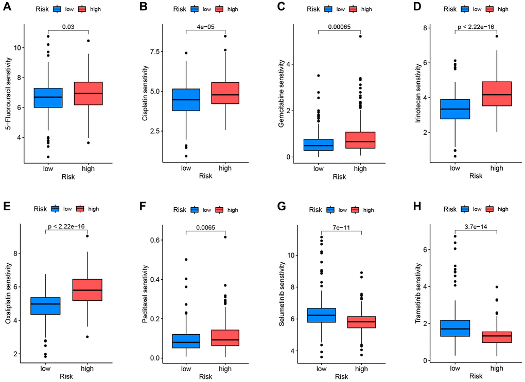 The R program “oncoPredict” was used to examine the differential medication sensitivity between high-risk and low-risk groups. Low-risk patients were sensitive to 5-fluorouracil, cisplatin, gemcitabine, irinotecan, oxaliplatin, and paclitaxel, whereas high-risk patients were susceptible to selumetinib and trametinib (Figure 10A–10H). These results help influence clinical medication for PC patients.