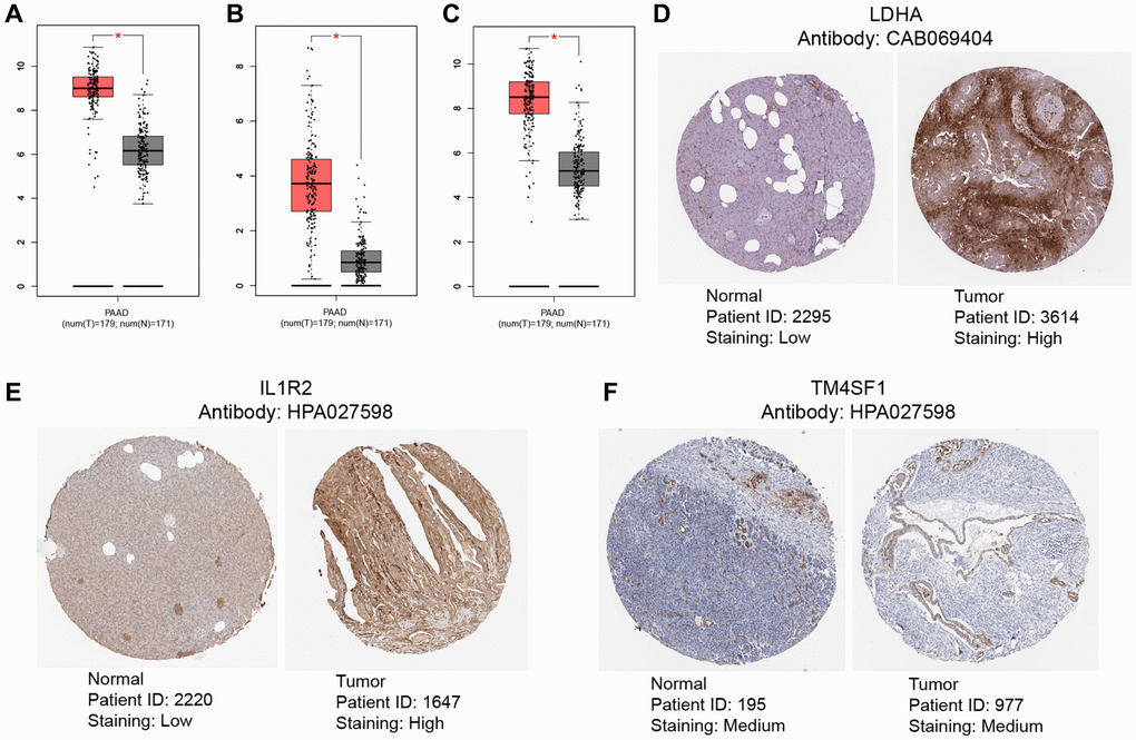 To evaluate the differential expression levels of model genes LDHA, IL1R2, and TM4SF1 across tumor and non-tumor tissues at the RNA level, scatter plots were generated using the GEPIA database. The expression of model genes was higher in tumor tissues compared to non-tumor tissues (Figure 11A–11C). The HPA database was queried for pictures of immunohistochemical investigation of LDHA, IL1R2, and TM4SF1. Figure 11D, 11E demonstrates that LDHA and IL1R2 were highly elevated in PC tissues, but TM4SF1 was moderately expressed in both PC and non-tumor tissues (Figure 11F).