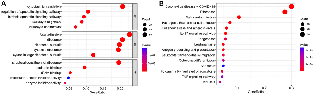 The GSE111672 dataset was obtained, which contains the RNA expression data of 27,000 cells from three individuals with PC. The range of genes discovered in each sample, the sequencing depth, and the proportion of mitochondrial content are shown in Figure 1A–1C, respectively. Single cells with a total number of identified genes more than 50, mitochondrial gene expression of less than 5%, and genes found in less than three cells were chosen (Figure 1A–1C). As seen in Figure 1D, 1E, sequencing depth was favorably connected with gene number and mitochondrial content, with correlation values of 0.92 and 0.2, respectively. After this, ten of the original 1500 highly variable genes between cells were labeled (Figure 1F). PCA was used to illustrate the top 15 principal components with P-value < 0.05 for the leading 1500 genes (Figure 1G, 1H). On the basis of the PCA findings, t-SNE analysis was done to further categorize all cells into 15 groups (Figure 1I). Each cell cluster was annotated using Human Primary Cell Atlas reference data. In clusters 2 and 5, neutrophils were found (Figure 1J). 350 NRGs were identified in total (Supplementary Table 1). GO functional enrichment and KEGG pathway enrichment studies were then used to study the biological function of these marker genes. Neutrophil marker genes were mostly engaged in biological processes such as leukocyte mobility, leukocyte chemotaxis, ribosomes, and plaque formation, as shown by GO functional enrichment analysis (Figure 2A). KEGG pathway enrichment analysis showed that these genes were largely associated with COVID-19, ribosomes, leukocyte trans endothelial migration, IL17 signaling pathway, TNF signaling route, and apoptosis (Figure 2B).