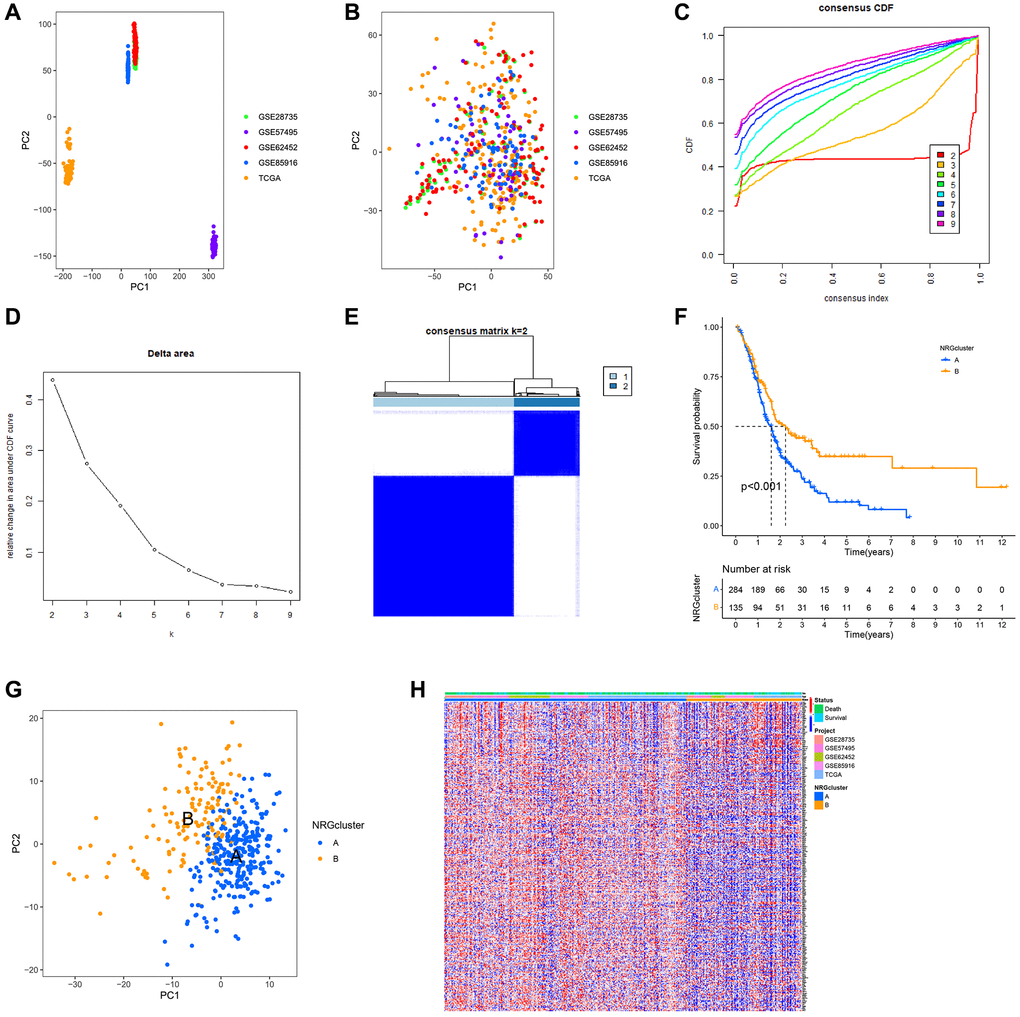 Using PCA, the TCGA, GSE28735, GSE62452, GSE57495 and GSE85916 datasets were combined to correct the data. After adjustment, the batch effect was effectively eliminated (Figure 3A, 3B). According to the expression of NRGs, the samples from GSE28735, GSE57495, GSE62452, GSE8516 and TCGA data sets were identified as two immune subtypes, NRGcluster A and NRGcluster B, which respectively represent high and low expression of NRGs. The k value should be adjusted to 2 for best performance, as evidenced by the area under the CDF curve and its relative change (Figure 3C–3E). In Figure 3C, when the slope of the curve in the CDF diagram is the most gentle, the clustering analysis results are the most reliable, and the corresponding k value is the best k value; Figure 3D shows the relative change of area under the CDF curve compared to k and k-1, and since there is no k = 1, the first point represents the total area under the CDF curve for k = 2; Figure 3E shows the matrix heat map when k = 2, and the white part rarely has blue infection, indicated that there is less interference between subgroups. To sum up, k = 2 is the optimal k value, and when k is 3 or other values, the interference between subgroups cannot be minimized. The Kaplan-Meir survival analysis indicated that patients with the NRGcluster A subtype had a poorer survival rate than those with the NRGcluster B subtype (p < 0.001) (Figure 3F). The PCA findings indicated a batch effect between NRGcluster A and B, suggesting that both clusters had strong internal consistency (Figure 3G). The survival and mortality status of the two patient groups were shown as heat maps in Figure 3H, along with the expression of neutrophil marker genes such as SRGN, BCL2A1, ALOX5AP, FPR1, BASP1, and CSFR. Individuals with the NRGcluster A subtype demonstrated elevated expression levels of neutrophil marker genes, suggesting that these patients may have aggressive neutrophil infiltration (Figure 3H).