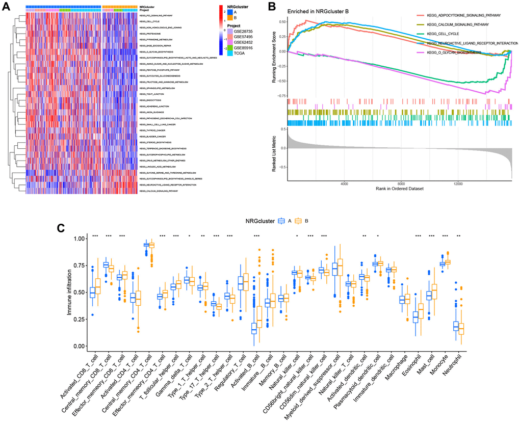 Subsequently, the unique biological processes and metabolic pathways of patients with distinct subtypes were investigated. The heat map generated by GSVA indicated substantial variations between the two groups in the activation and inhibition of 30 metabolic pathways. P53 signaling pathway, cell cycle, base excision repair, amino sugar and nucleotide sugar metabolism, glycolysis and gluconeogenesis, sphingolipid metabolism, endocytosis, glycerophospholipid metabolism, and linoleic acid metabolism were highly abundant in NRGcluster A. In contrast, NRGcluster B was markedly enriched in glycine, serine, and threonine metabolism, neuroactive ligand-receptor interaction, and calcium signaling pathway (Figure 4A). GSEA demonstrated that the neuroactive ligand-receptor interaction, the calcium signaling system, and the adipocytokine signaling pathway were significantly enriched in NRGcluster B patients. The cell cycle and O-glycan production were dramatically enhanced in NRGcluster A patients (Figure 4B).