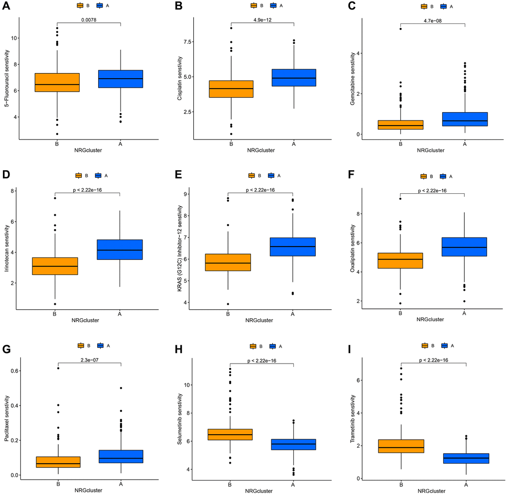 The Genetics of Drug Sensitivity in Cancer database was used to evaluate the relationship between the two categories and the sensitivity to numerous first-line chemotherapy treatments. The NRGcluster B subtype was more sensitive to 5-fluorouracil, cisplatin, KRAS (G12C) inhibitor-12, gemcitabine, irinotecan, oxaliplatin, and paclitaxel, but less sensitive to selumetinib and trametinib (Figure 5A–5I).