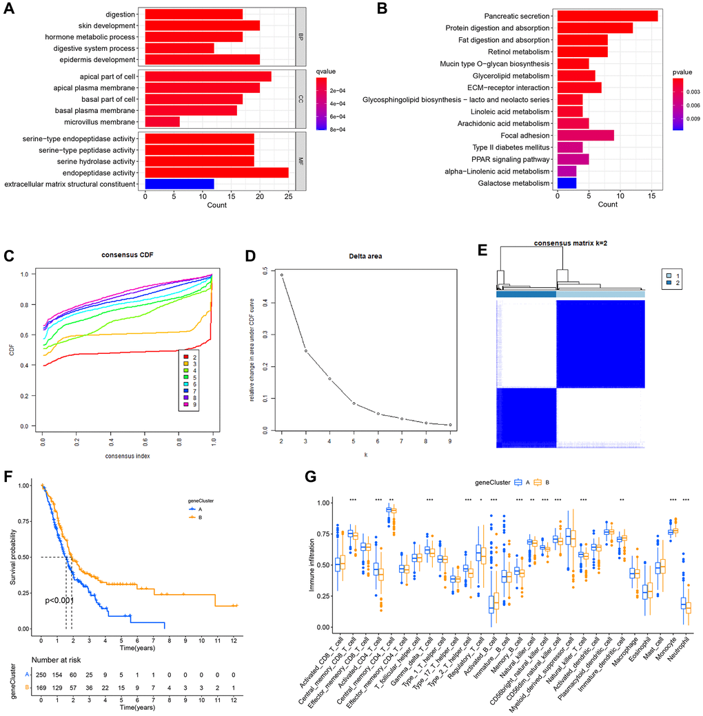 Subsequently, the genetic alterations and underlying processes of NRG expression patterns were investigated. Using the “limma” R package, the differentially expressed genes of NRGcluster A and B were selected based on the following criteria: |log2 FC| > 1 and adjusted P-value < 0.05. A total of 285 genes with differential expression were found (Supplementary Table 2). The functions of these differentially expressed genes were then identified. The differentially expressed genes were mostly connected with epidermal development, the apical region of the cell, endopeptidase activity, extracellular matrix structural component, etc., as determined by GO functional enrichment analysis (Figure 6A). The majority of differentially expressed genes were involved in pancreatic secretion, protein digesting, and absorption-related processes, as shown by KEGG pathway enrichment analysis (Figure 6B). To examine further the influence of differently expressed genes on PC prognosis and tumor immune microenvironment, all patients were grouped using the “Consensus Cluster Plus” R program based on differentially expressed genes. Two immunological isotypes (geneClusters A and B) were distinguished (Figure 6C–6E). Patients with geneCluster A had a considerably shorter survival rate than those with geneCluster B (Figure 6F). The ssGSEA found distinct immune cell infiltration between the two categories. Neutrophils, activated CD4+ T cells, and central memory CD8+ T cells were the most abundant infiltrating cells in geneCluster A, whereas monocytes and activated CD8+ T cells were less abundant (Figure 6G).