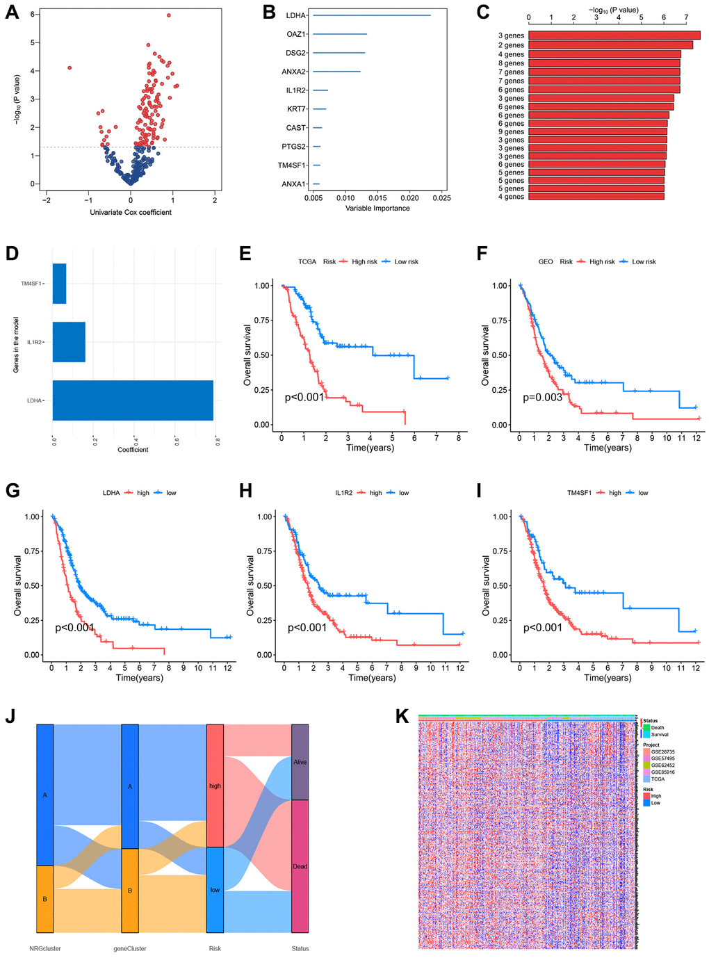 To further study the predictive usefulness of NRGs in PC, a univariate Cox regression analysis was conducted to identify NRGs linked with patient prognosis. Each potential gene is represented by a red dot in the volcano map (Figure 7A). Using the RSFVH method, the 10 most significant genes were analyzed further (Figure 7B). Using an algorithm, survival analysis p-values were analyzed. The optimal gene combination (LDHA, IL1R2, and TM4SF1) was determined (Figure 7C), and a predictive model was created using multivariate Cox regression. The correlation coefficients of the three model genes were shown in Figure 7D, and risk scores of each sample were computed with the help of Cox coefficients and gene expression profiles. The GEO database datasets GSE28735, GSE62452, GSE57495, and GSE85916 were utilized as the validation set. To evaluate the accuracy of the prognostic model, the training and validation sets were split into high-risk and low-risk groups based on the median risk score. Survival study of the TCGA and GEO datasets found that the survival time of high-risk patients was shorter than that of low-risk patients (Figure 7E, 7F). For all three model genes (LDHA, IL1R2, and TM4SF1), the high-expression group had a lower life period than the low-expression group (Figure 7G–7I). The alluvial plot indicated the link between NRGcluster typing, gene Cluster type, risk categorization, and sample survival status (survival or death) and supported the reliability and consistency of the analytical findings (Figure 7J). The majority of genes were elevated in the high-risk group, indicating that high-risk individuals may have aggressive neutrophil infiltration (Figure 7K).