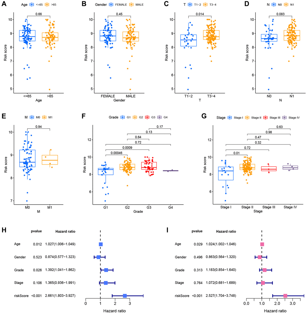 After merging clinical data and risk scores from TCGA datasets, the risk scores were compared across clinical groups using the Wilcoxon signed-rank test to investigate the association between the model and the clinical features of the patients. The risk ratings did not vary substantially across ages, genders, or M stages (Figure 8A, 8B and 8E). Due to the limited number of patients with M-stage tumors, the Wilcoxon signed-rank test findings might be distorted. The risk scores of patients with advanced T-stage, pathological grade, and clinical stage were considerably elevated (Figure 8C, 8F and 8G). The difference between N1 and N0 patients was close to statistical significance (p = 0.083), and stage N1 patients had a higher risk score (Figure 8D). Age, pathological grade, and risk score were substantially linked with the prognosis of patients with PC, as evidenced by the forest plot of univariate Cox analysis findings (Figure 8H). Furthermore, the forest plot of multivariate Cox analysis findings revealed that age and risk score are independent prognostic markers for PC patients (Figure 8I).