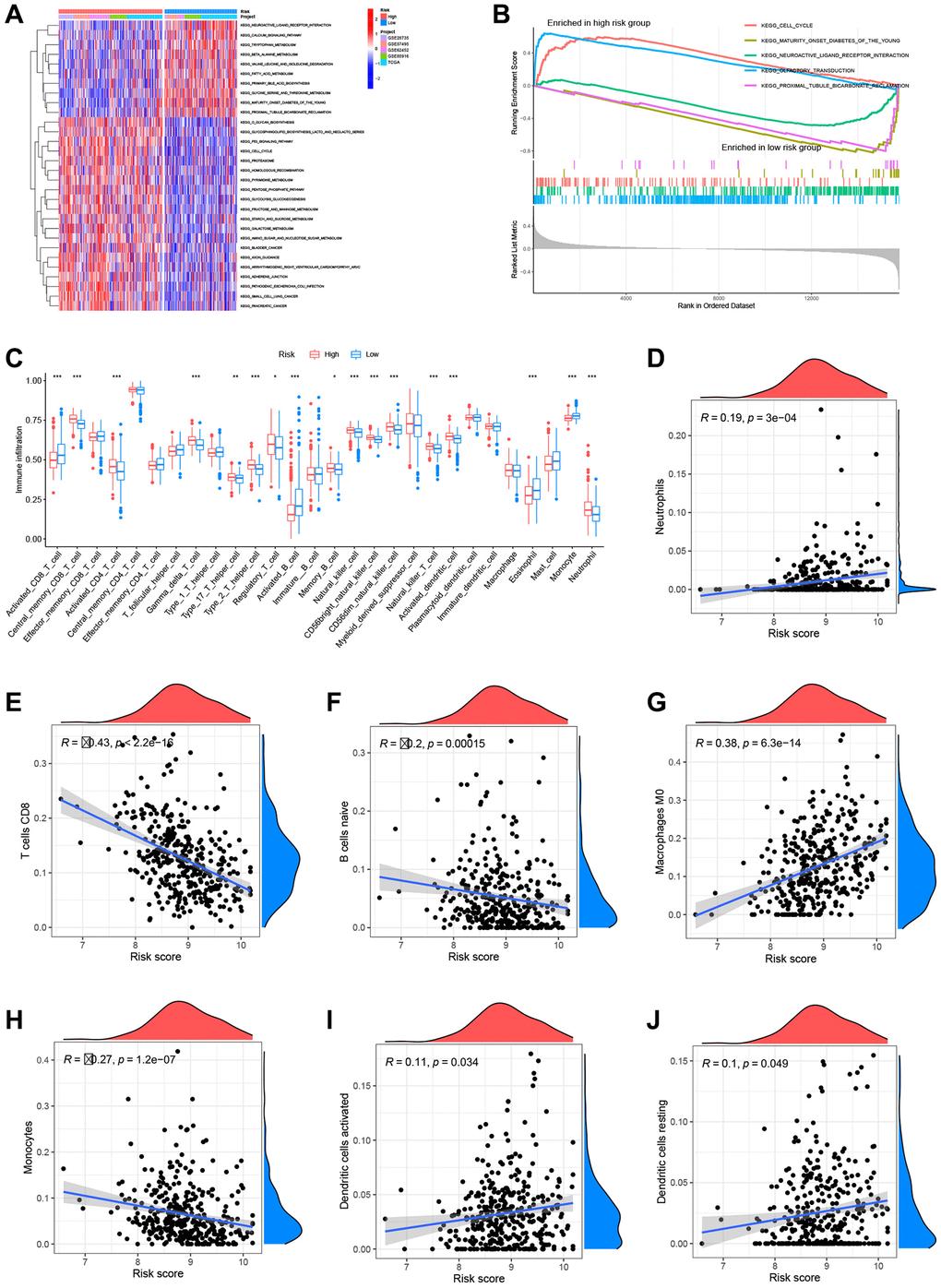 To assess the metabolic pathway activity in high-risk and low-risk samples, GSVA and GSEA were conducted. The high-risk group had considerably greater glycan biosynthesis, P53 signaling pathway, and cell cycle activity than the low-risk group. In contrast, the activities of neuroactive ligand-receptor interaction and calcium were increased in the group at low risk (Figure 9A). Cell cycle and olfactory transduction were typically active in the high-risk group, while maturity-onset diabetes of the young and neuroactive ligand-receptor interaction were passive (Figure 9B). To further study the link between risk score and TME in PC, ssGSEA was used to analyze immune cell infiltration across groups with high and low risk. The high-risk group had higher infiltration of activated CD4+ T cells, NK cells, and neutrophils, whereas the low-risk group demonstrated increased infiltration of activated CD8+ T cells and activated B cells (Figure 9C). In addition, the CIBERSORT method was used to calculate the infiltration scores of 22 immune cell subtypes in each sample (Supplementary Figure 1) (7 T cell subtypes, naïve and memory B cells, plasma cells, NK cells, bone marrow subsets, etc.). Neutrophils, M0 macrophages, active dendritic cells, and resting dendritic cells associated considerably and positively with the risk score, while CD8+ T cells, naïve B cells, and monocytes linked significantly and negatively with the risk score (Figure 9D–9J).