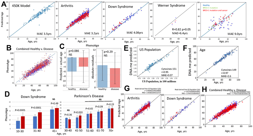 In testing PhenoAge, thought to be biologically more relevant, we expanded the approach to multiple independent studies with 450K DNAme arrays on Arthritis, Multiple Sclerosis, Down Syndrome, Parkinson’s, IBS, Werner Syndrome. We analyzed whether predicted age is on average higher for disease samples as compared to their healthy controls. Additionally, instead of MAE on one 450K correlation, which is the Median from an experimental n=1, we quantified the errors as the arithmetic Means of predicted minus actual age, with Standard Deviation (SD) and p-values, in these six large data studies, experimental n=6. In other words, we applied the typical data analysis that is used in biomedical research, when testing for a relevant change.