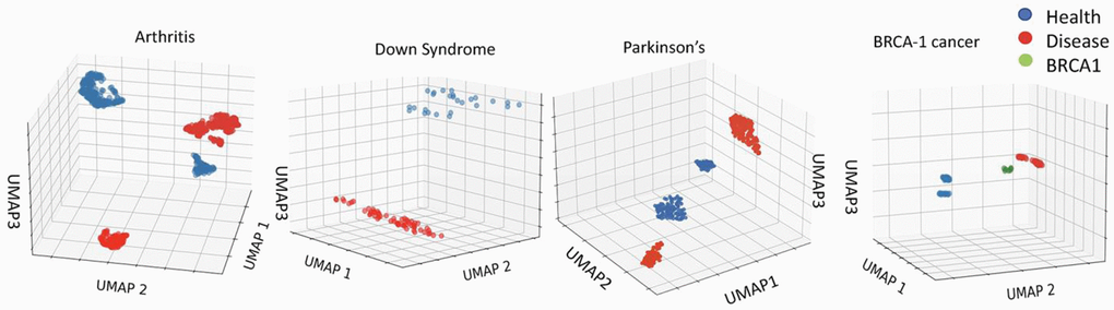 As expected from the body of published literature, inflammaging, trisomy and diseases are robustly different from health, and this can be detected with much higher resolution than EN by analyzing the primary, un-adjusted, non-linearized data of the DNAme array. For example, Uniform Manifold Approximation and Projection (UMAP), which preserves the topological structure of the data (with all 450k+ cytosines) while embedding it in multi-dimensional computational space, robustly distinguishes between health and disease in the studied here 450K array datasets, Figure 3 [42].
