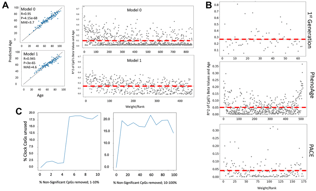 In fact, the ranking of cytosines as per their methylation change with age became better, yet MAE became slightly worse, after all the original clock picked cytosines were removed from the dataset, and as expected, EN selected the next weighted best fit linear predictor set, Figure 4A. The redundancy of cytosine sets is known, e.g., EN is “resilient” to specific cytosines, or their combination, and it is the EN process on large data that gives the linear correlation. In support of these finding, the changes of DNAme with age were not the determinant of the ranking of cytosines by the published 1st generation clock trained on age or PhenoAge, and PACE trained on health/disease parameters [1–5], (Figure 4B). The red dashed lines are the mean coefficient of variation and that the line remains flat with age signifies the irrelevance of age-specific changes in DNAme for the ranking of clock’s cytosines.