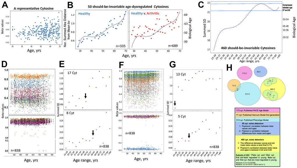 These results suggest that biological age can be measured in a batch effect resilient approach through quantification of the SD of the methylation of cytosines that should-be-invariable, yet are age deregulated. The natural curve of biological aging defined by this approach is not linear; it has healthy low-noise plateaus and upward shifts at specific ages. In this method, DNAme noise is the biomarker and a particular set of cytosines is the detector of such biomarker. This method is different from and moreover, orthogonal to, the linear predictors that are based on population statistics. Importantly, regardless of the selection of all the cytosines that should-be-invariable (50, 460) or their subsets most or least regulated in young (1, 5, 8, 13, 17), an increase of biological noise with age was always observed, and there was never a high in young to low in old progression for any cytosine of the noise barometer.