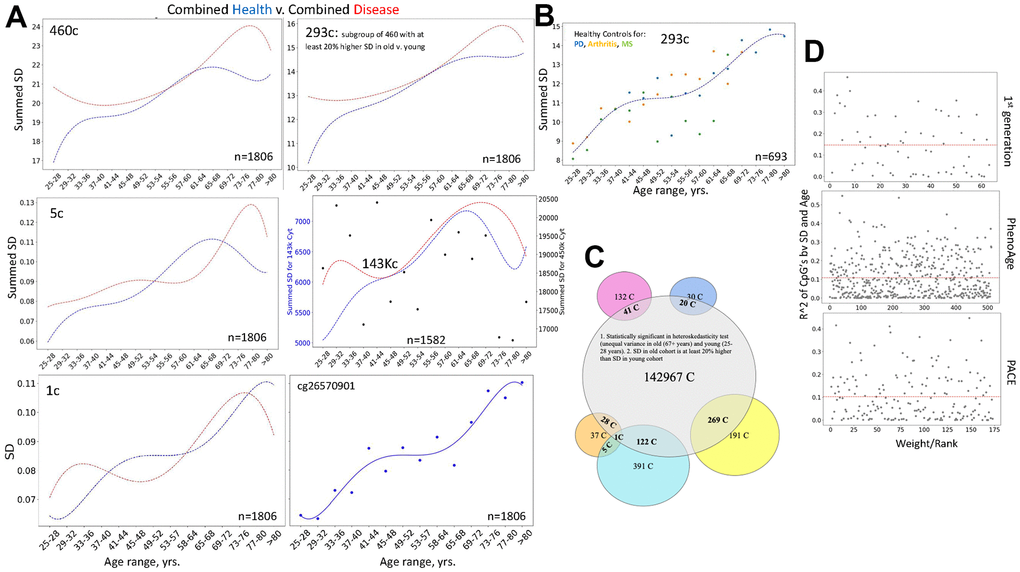 Next, we examined differences between health and disease, using the combined DNAme array data from the six studies by different laboratories. As mentioned, all 460 cytosines of noise barometer self-manifested higher SD of beta values in the old as compared to young, and 293 of these cytosines had at least 20% increase in their SDs with age. Interestingly and consistently with the fundamental paradigm of DNAme noise as a biomarker of aging and disease, summing the SDs of 460, 293 or 5 cytosines yielded similar patterns of healthy biological aging and the disease-imposed shifts, Figure 6A. Moreover, this pattern of biological aging and difference between health and disease were also yielded by SD of a single noise barometer cytosine (one of the most regulated in young), Figure 6A. The overlap between health and disease at certain ages is expected from the overall elevation of diseases with age (not just those studied), and from the possibility of pathologically diminished biological noise in some disease stages due to reduced complexity of blood cells (less lymphocytes and greater prevalence of inflammatory macrophages).