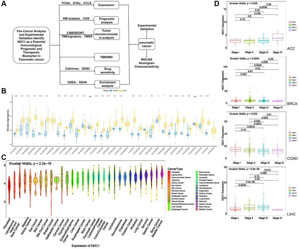 In the current study, three databases, TCGA, Genotype-Tissue Expression (GTEx) and Cancer Cell Line Encyclopedia (CCLE), were visited to study the expression of NDC1 in 33 types of cancer and explore its prognostic significance. In the meantime, we also explored the potential association of NDC1 with TME, drug sensitivity, Gene Set Enrichment Analysis (GSEA), Gene Set Variation Analysis (GSVA), tumor mutational burden (TMB), microsatellite instability (MSI). Notably, we focus on pancreatic cancers to analyze the prognostic significance of NDC1. The results revealed that NDC1 is closely related to the immunity in tumor and has the potential as a target for tumor therapy (Figure 1A).