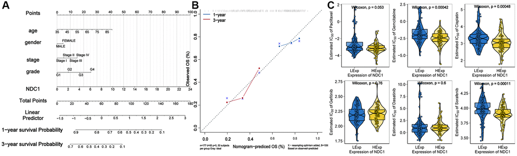 A nomogram for prognosis of PAAD based on NDC1 expression and several significant clinical characteristics was established. NDC1 expression was found to be significantly prognostic for survival of PAAD (Figure 10A). In addition, this study draws correction curves for one year and three years at the same time, and finds that the OS predicted by Nomo chart is in good agreement with the actual observed OS, and is close to the slope, suggesting that Nomo chart has good prediction efficiency. (Figure 10B).