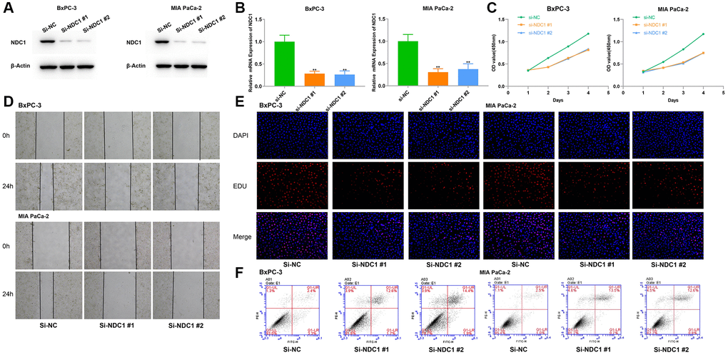 The effect of NDC1 on pancreatic cancer cell function was determined by loss-of-function experiments expressed in pancreatic cancer (PC) and contributes to drug resistance and poor prognosis. In vitro, we silenced the expression of NDC1 in human pancreatic cancer cell lines BxPC-3 and MIA PaCa-2, respectively, and the interference efficiency was verified by RT-qPCR and Western blot analysis (Figure 11A, 11B). The results of Our pan-cancer analysis showed that NDC1 is highly MTT and 5-ethynyl-20 deoxyuridine (EdU) experiments showed that silencing NDC1 could significantly inhibit the proliferation of pancreatic cancer cells (Figure 11C, 11E). Scratch assay and apoptosis assay showed that downregulation of NDC1 expression reduced cell migration ability and promoted cell apoptosis (Figure 11D, 11F).
