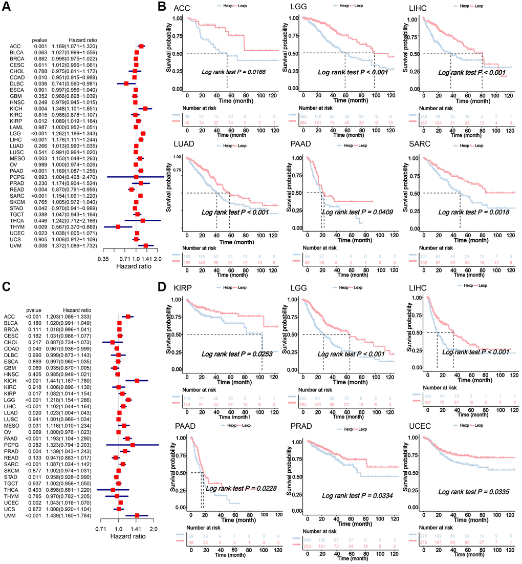 Expression of NDC1 was analyzed in 33 cancer types based on data from TCGA and GTEx. Higher expression of NDC1 was demonstrated in 26 cancer types, including Adrenocortical carcinoma (ACC), Bladder Urothelial Carcinoma (BLCA), Breast invasive carcinoma (BRCA), Cervical squamous cell carcinoma and endocervical adenocarcinoma (CESC), Cholangiocarcinoma (CHOL), Colon adenocarcinoma (COAD), Esophageal carcinoma (ESCA), Glioblastoma multiforme (GBM), Head and Neck squamous cell carcinoma (HNSC), Kidney Chromophobe (KICH), Acute Myeloid Leukemia (LAML), Brain Lower Grade Glioma (LGG), Liver Hepatocellular carcinoma (LIHC), Lung adenocarcinoma (LUAD), Lung squamous cell carcinoma (LUSC), Ovarian serous cystadenocarcinoma (OV), Pancreatic adenocarcinoma (PAAD), Prostate adenocarcinoma (PRAD), Rectum adenocarcinoma (READ), Sarcoma (SARC), Skin Cutaneous Melanoma (SKCM), Stomach adenocarcinoma (STAD), Testicular Germ Cell Tumors (TGCT), Thyroid carcinoma (THCA), Uterine Corpus Endometrial Carcinoma (UCEC), Uterine Carcinosarcoma (UCS), as compared to the expression in normal tissues (Figure 1B). The expression of NDC1 in different cell lines from the CCLE database was shown in (Figure 1C). In addition, the expression of NDC1 was associated with the tumor stage in ACC, BRCA, COAD and LIHC (Figure 1D). The prognostic significance of NDC1 for overall survival (OS) and progression-free survival (PFS) of cancer patients was analyzed by Univariate Cox regression. It was found that NDC1 expression was closely related to the OS of patients with ACC, COAD, Lymphoid Neoplasm Diffuse Large B-cell Lymphoma (DLBC), KICH, Kidney renal papillary cell carcinoma (KIRP), LGG, LIHC, MESO, PAAD, READ, SARC, STAD, THYM, UCEC and Uveal Melanoma (UVM) (Figure 2A). Notably, high expression of NDC1 was prognostic for poor OS of ACC, LGG, LIHC, LUAD, PAAD and SARC (Figure 2B). In the meantime, NDC1 expression was closely related to the PFS of patients with ACC, COAD, KICH, KIRP, LGG, LIHC, LUAD, Mesothelioma (MESO), PAAD, PRAD, SARC, STAD, UCEC, UVM (Figure 2C), and high expression of NDC1 was prognostic for poor PFS of KIRP, LGG, LIHC, PAAD, PRAD and UCEC (Figure 2D).