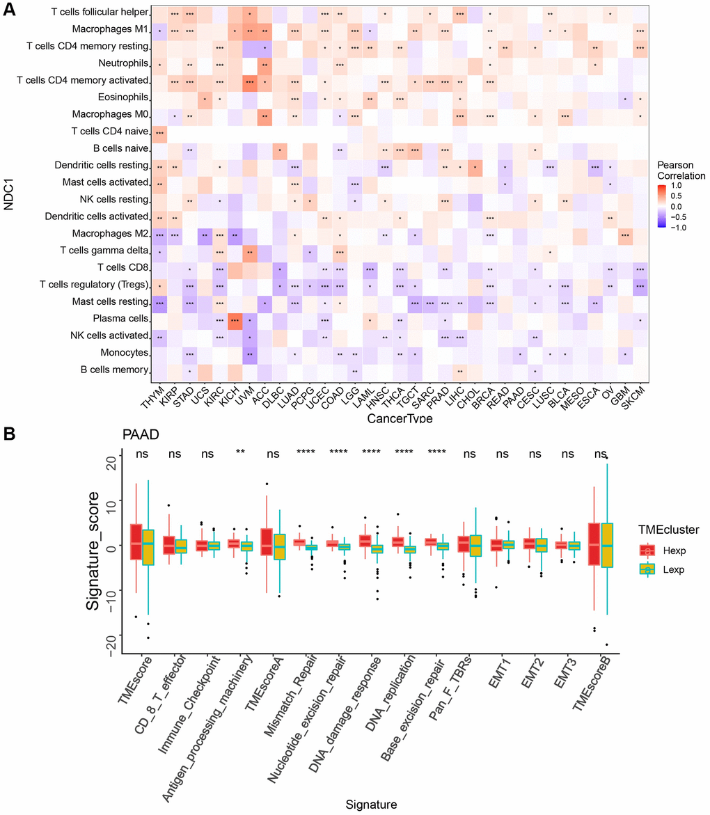 The TME plays an important role in tumor diagnosis, survival outcome and clinical therapeutic sensitivity. Here, we found that the expression of NDC1 was closely associated with the immune infiltration in TME. Specifically, NDC1 was significantly associated with T cells follicular helper in 11 cancer types, with Macrophages M1 in 16 cancer types and with T cells CD4 memory resting in 12 cancer types (Figure 3A). In addition, analysis in PAAD also showed significant associations with Antigen_processing_machinery, Mismatch_Repair, Nucleotide_excision_repair, DNA_damage_response, DNA_replication, Base_excision_repair (Figure 3B).