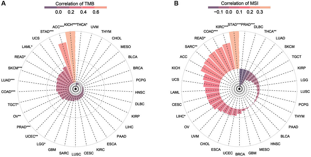 TMB and MSI are two novel biomarkers for tumor immunotherapy. TMB refers to the number of somatic non-synonymous mutations in a specific genomic region, which can indirectly reflect the ability and degree of neoantigen production of tumors and predict the efficacy of immunotherapy in a variety of tumors [18–20]. MSI refers to the phenomenon of short, repetitive DNA sequence length changes caused by insertion or deletion mutations during DNA replication, and is often caused by defective MMR function [21]. Correlation analysis revealed that NDC1 expression was significantly associated with TMB in THCA, KICH, ACC, STAD, LAML, READ, SKCM, LUAD, COAD, TGCT, OV, PRAD, UCEC, LGG (Figure 6A) and evidently associated with MSI in PRAD, THCA, STAD, KIRC, COAD, READ, SARC, LIHC (Figure 6B).