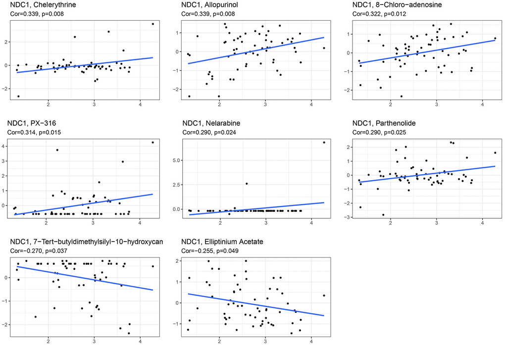 The combination of surgery with chemotherapy has significant therapeutic effect in treatment of early tumors, for example, patients with pancreatic cancer who received adjuvant chemotherapy with gemcitabine after surgery had a higher median overall survival than those who received no chemotherapy compared with those who received observation, and dual therapy provided a higher survival benefit than gemcitabine alone [22]. Here, the CellMiner database was visited to analyze the relationship between NDC1 expression and some common anti-tumor drugs. It was found that high NDC1 expression was highly associated with the development of resistance to multiple anti-tumor drugs (Table 1). More specifically, NDC1 expression was positively associated with the drug resistance of Chelerythrine, Allopurinol, 8-Chloro-adenosine, PX-316, Nelarabine, Parthenolide, but negatively associated with 7-Tert-butyldimethylsilyl-10-hydroxycamptothecin and Elliptinium Acetate (Figure 7).