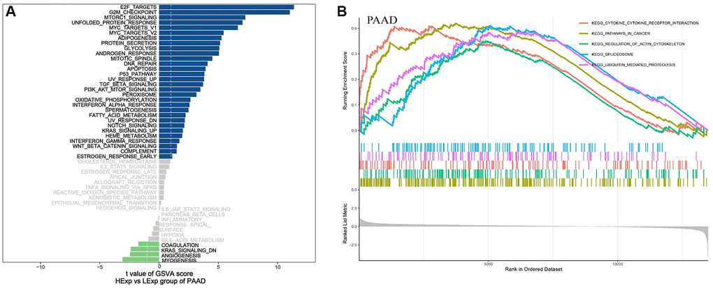 To further study the molecular mechanisms of NDC1 in PAAD, PAAD samples were divided into high- and low-expression groups according to the median NDC1 expression. GSVA was performed and the results showed that high NDC1 was mainly involved in E2F_TARGETS, G2M_CHECKPOINT, MTORC1_SIGNALING, UNFOLDED_PROTEIN_RESPONSE and MYC_TARGETS_V1 in PAAD (Figure 8A). GSEA was performed and the results showed that high NDC1 was mainly involved in CYTOKINE_CYTOKINE_RECEPTOR_INTERACTION, PATHWAYS_IN_CANCER, REGULATION_OF_ACTIN_CYTOSKELETON, SPLICEOSOME, UBIQUITIN_MEDIATED_PROTEOLYSIS in PAAD (Figure 8B).