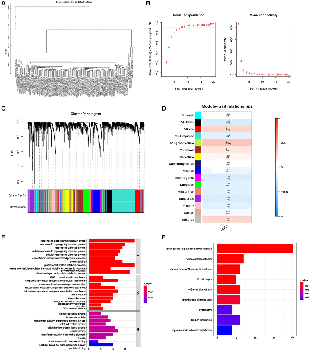 We further constructed WGCNA network based on PAAD expression profile data to explore NDC1-related co-expression network in PAAD. The outlier samples were deleted, and the samples with a height below 20000 were retained for subsequent analysis after clustering the samples. The β was set as 6 according to “sft$powerEstimate” function. A total of 16 gene modules were obtained, including MEblack (270), MEblue (504), MEbrown (491), MEcyan (75), MEgreen (365), MEgreenyellow (166), MEgrey (278), MEmagenta (213), MEmidnightblue (68), MEpink (225), MEpurple (179), MEred (319), MEsalmon (85), MEtan (98), MEturquoise (1,280), and MEyellow (384). Module-trait correlation analysis found that the MEgreenyellow module was the highest associated with the clinical traits of PAAD (cor = 0.32, p = (2e-04)) (Figure 9A–9D). Genes of the MEgreenyellow module was further analyzed by Gene Ontology (GO) and Kyoto Encyclopedia of Genes and Genomes (KEGG) enrichment analysis. The most enriched GO terms were response to endoplasmic reticulum stress, response to topologically incorrect protein, response to unfolded protein (Figure 9E), and the most enriched KEGG pathways were involved in Protein processing in endoplasmic reticulum, Vibrio cholerae infection, Various types of N−glycan biosynthesis (Figure 9F).