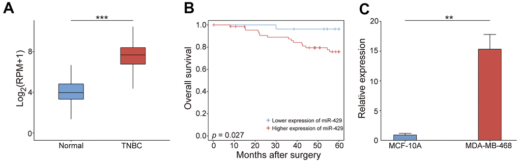 This study investigates the process by which miR-429 affects the progression of TNBC. miR-429 expression was assessed using TCGA data and the resulting data indicated that its expression was markedly enhanced in TNBC tissues in contrast to normal tissues (Figure 1A). Survival analysis indicated that individuals with increased miR-429 expression had a considerably shorter 5-year OS than those with reduced miR-429 expression (Figure 1B), therefore, implying the function of miR-429 as an adverse factor in breast cancer prognosis. Next, the expressed miR-429 in TNBC cells was examined and the data indicated a notable increase in miR-429 expression in the TNBC cell line MDA-MB-468 than in normal breast cells MCF-10A (Figure 1C). Overall, these data confirm that miR-429 is considerably elevated in cell lines and tissues of TNBC and is linked with poorer prognoses in TNBC patients.