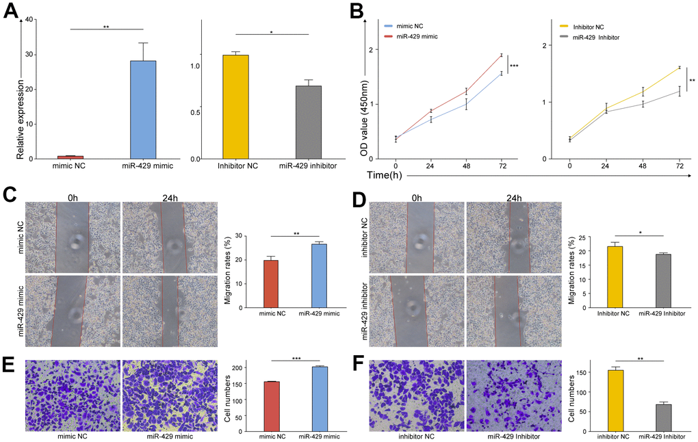 The biological functions of miR-429 were examined through gain- and loss-of-function studies in vitro. The knock-down and up-regulation efficiency was evaluated by qRT-PCR, respectively. The study confirms that miR-429 expression was amplified in miR-429 mimic transfected cells and diminished in the miR-429 inhibitor transfected cells (Figure 2A). Various in vitro experiments were carried out as well. CCK-8 assays demonstrated an increase in the viability of MDA-MB-468 cells linked to the upregulation of miR-429, while its downregulation decreased cell viability (Figure 2B). Wound healing assay indicated that miR-429 overexpression resulted in a considerably higher percentage of MDA-MB-468 cell healing (Figure 2C), whereas this percentage was considerably lower in the downregulated miR-429 group in contrast to the control (Figure 2D). Transwell assay revealed that elevated expression of miR-429 considerably enhanced the invasive ability of MDA-MB-468 cells (Figure 2E), however, downregulation of miR-429, played the opposite role (Figure 2F). In summary, the upregulated miR-429 notably promoted the growth, migration, and invasion of TNBC cell cells, whereas the downregulation of miR-429 played the opposite role.