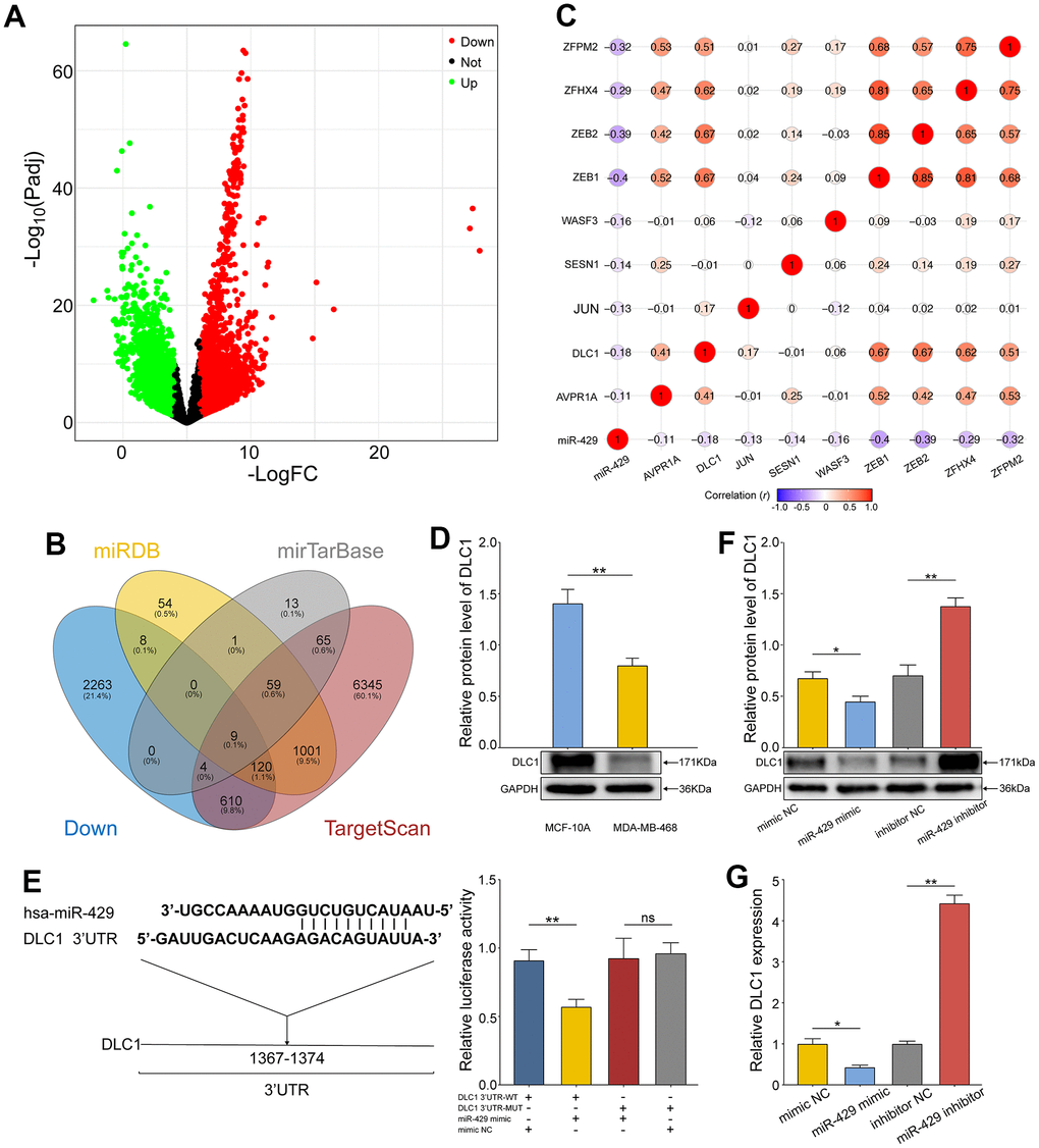 Gene Expression Differential Analysis and target gene prediction were utilized to obtain the relevant genes concerning miR-429. Differential analysis of the mRNA expression profile of TCGA-TNBC revealed a total of 3948 significantly differentially expressed mRNAs (DEmRNAs), of which the upregulated and downregulated mRNAs numbered 2360 and 1588, respectively (Figure 3A). Afterward, the target gene prediction of miR-429 was performed by miRDB, Target Scan, and miRTarBase database, and finally, the significantly differentially down-regulated mRNAs were intersected with the predicted target genes of miR-429 to retrieve nine candidate genes (Figure 3B). Pearson correlation analysis of the nine candidate genes and miR-429 revealed a significant negative correlation of DLC1 with miR-429 (Figure 3C). In addition, cellular experiments depicted that protein expression of DLC1 was notably reduced in TNBC cells than in normal breast cells (Figure 3D).
