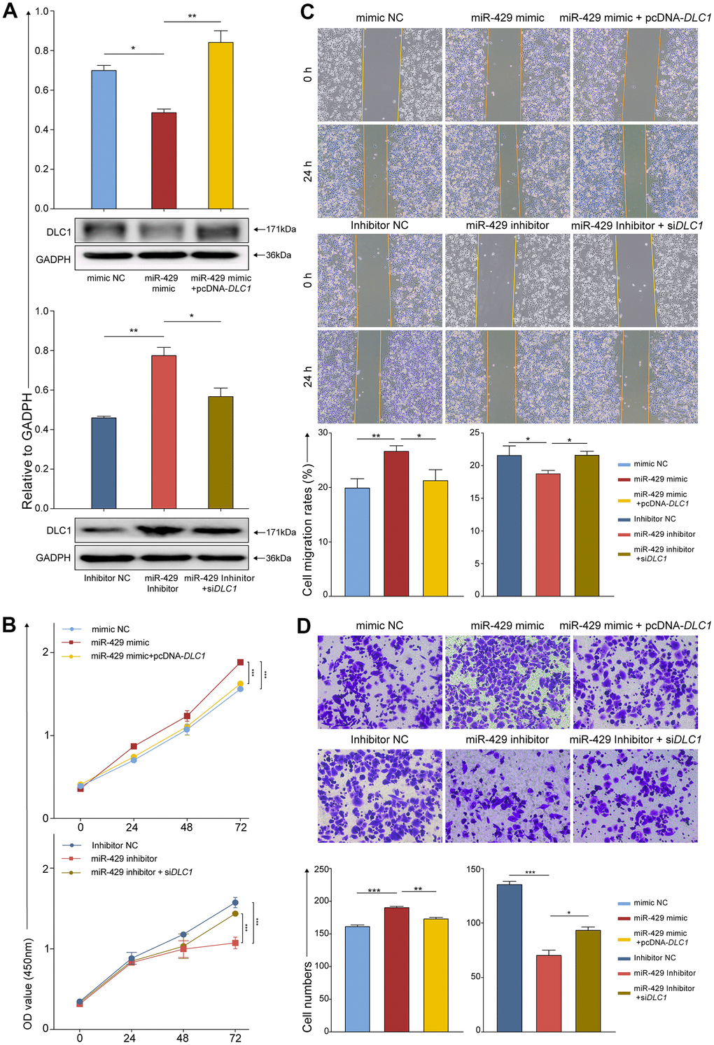 As shown by the CCK-8 assay, the viability of the cell was notably enhanced in the miR-429 mimic group than in the mimic NC group and was partially reduced when miR-429 and DLC1 were simultaneously overexpressed. Similarly, in contrast to the inhibitor NC group, the viability of the cell was markedly lowered in the miR-429 inhibitor group, and was partially restored when miR-429 and DLC1 were simultaneously inhibited (Figure 4B). Wound healing and transwell assays indicated that the cell migrative and invasive of the miR-429 mimic group was notably increased in contrast to the mimic NC group, while this ability of the miR-429 mimic+pcDNA-DLC1 group was reduced in contrast to the miR-429 mimic group. Considerably diminished migrative and invasive were depicted in the miR-429 inhibitor group than in the inhibitor NC group, and cell migration and invasion were partially restored when both miR-429 and DLC1 were inhibited (Figure 4C, 4D). The above experimental data suggest that miR-429 may negatively regulate DLC1 expression, which led to the development of TNBC.