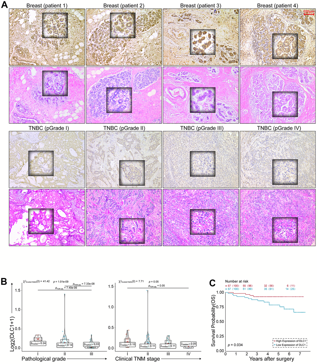 The clinical significance of DLC1 was evaluated by IHC in 114 TNBC archival tissues. The staining scores were evaluated by Image software and the clinical features were shown in Table 2. As shown in Figure 5A, the positive stain of DLC1 was in the cytoplasm of cells, A higher expression of DLC1 expression was shown in normal breast tissue compared to TNBC tissue. The staining intensity presented inverse correlations with clinical TNM stage (p = 0.05) and histopathological grade (p = 1.01e - 09) (Figure 5B). Kaplan-Meier survival curve indicated that the expression levels of DLC1 were positively correlated with the overall survival of patients with TNBC (Figure 5C). These results suggest that DLC1 may be an unfavourable factor for the occurrence and development of TNBC.